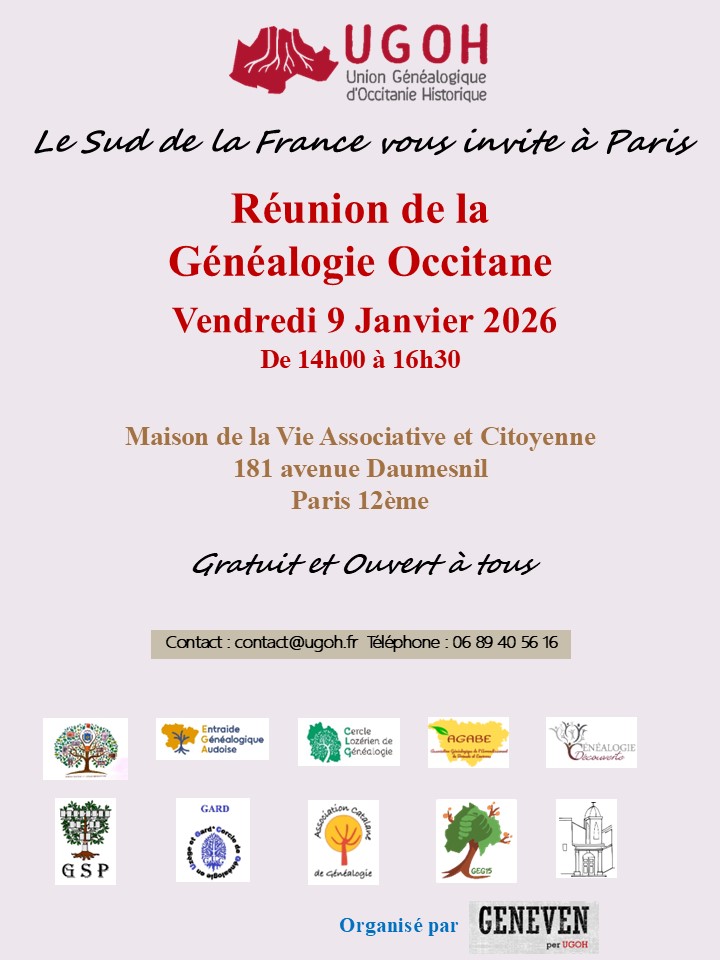 Une réunion de la généalogie occitane se tiendra vendredi 9 janvier de 14h à 16h30 dans le 12ᵉ arrondissement de Paris.