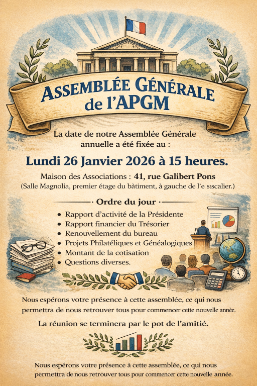 Assemblée Générale de l’ APGM La date de notre Assemblée Générale annuelle a été fixée au : Lundi 26 Janvier 2026 à 15 heures. Maison des Associations : 41, rue Galibert Pons (Salle Magnolia, premier étage du bâtiment, à gauche de l’escalier.)   Nous espérons votre présence à cette assemblée, ce qui nous permettra de nous […]