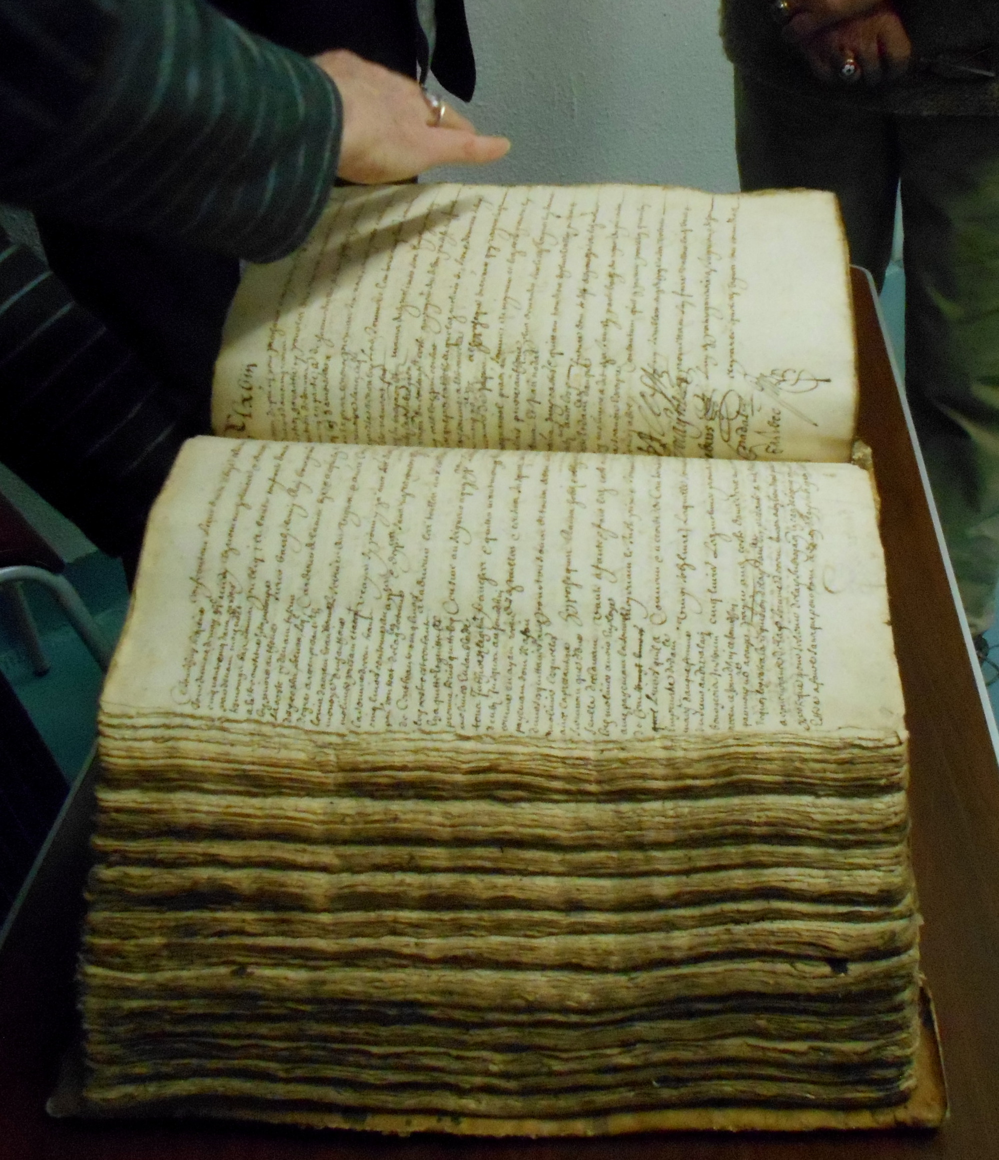 Pour économiser le papier, très précieux, on utilisait au maximum la place ; ici plusieurs registres sont reliés ensemble ; les pages sont soigneusement cousues et de telle façon qu’elle est particulièrement solide. On peut ouvrir très facilement le registre et le mettre à plat sans qu’il s’abîme.