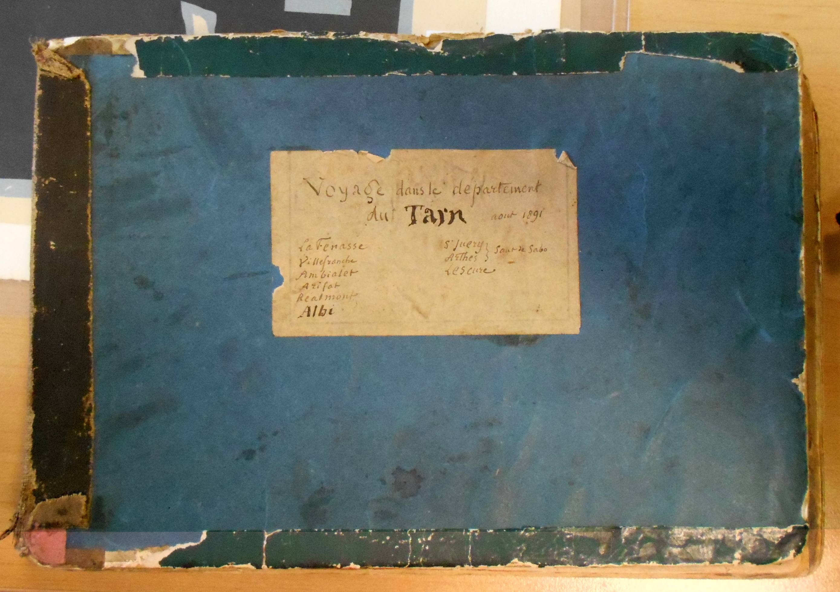 Livret cartonné contenant des croquis dont les premiers ont des couleurs très délicates (aquarelles) sur des villages des environs d’Albi : La Fenasse,Villefranche, Ambialet, Arifat,Réalmont, Alby ,St Juéry, Arthès(Saut de Sabot) Lescure.